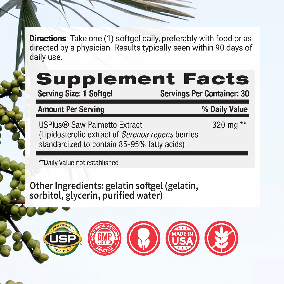 Saw Palmetto Extract USP (Lipidosterolic extract of Serenoa repens berries standardized to contain 85%-95% fatty acids), Gelatin softgel (gelatin, sorbitol, glycerin, purified water)